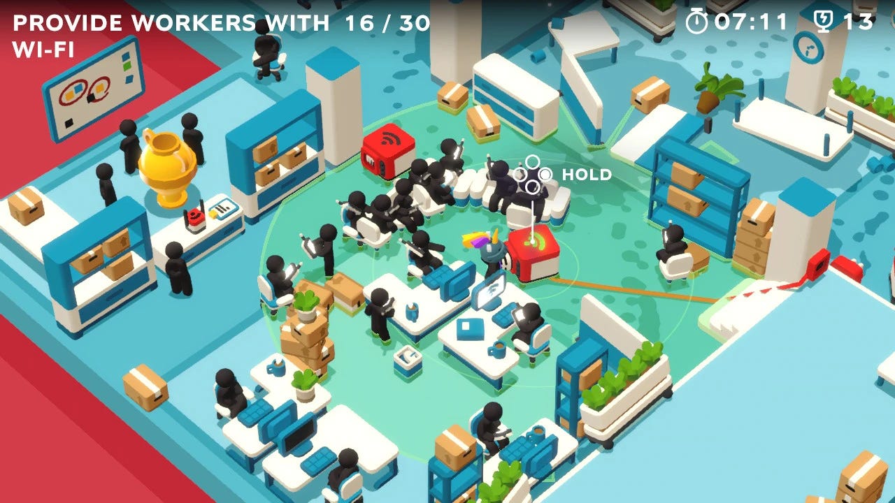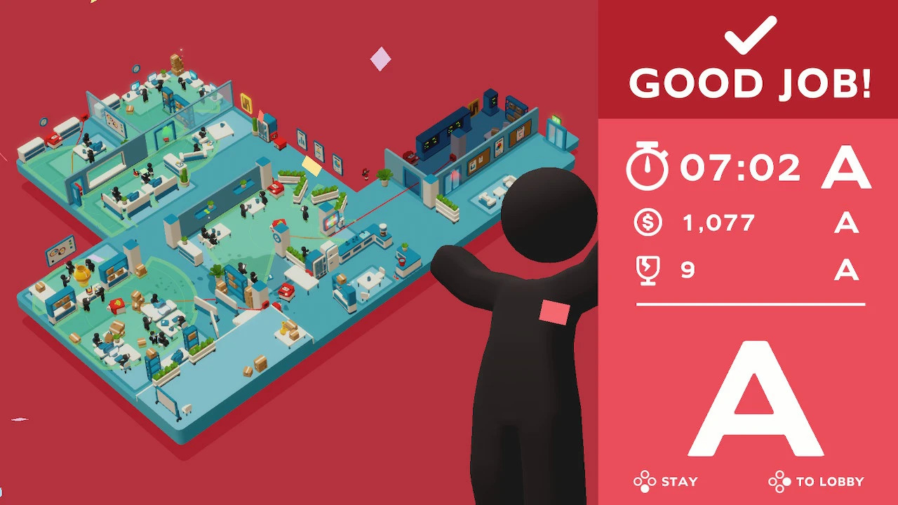 While Good Job! is ostensibly a simple game about mundane tasks, the fun lies in the chaos it allows you to play with. For example, in some scenarios you will need to position moveable Wi-Fi into the right spaces so that everyone in a room has access. This is constrained by the number of carts, the location of the plugs that you will have to plug in, and the location of the workers. But you can solve this puzzle any number of different ways. For example, you could simply position the carts in the exact locations so that they would reach people, only to realize that the electric cords don’t quite reach. You could then see the Wi-Fi repeaters nearby, reposition them neatly, and complete the task- easy-peasy.