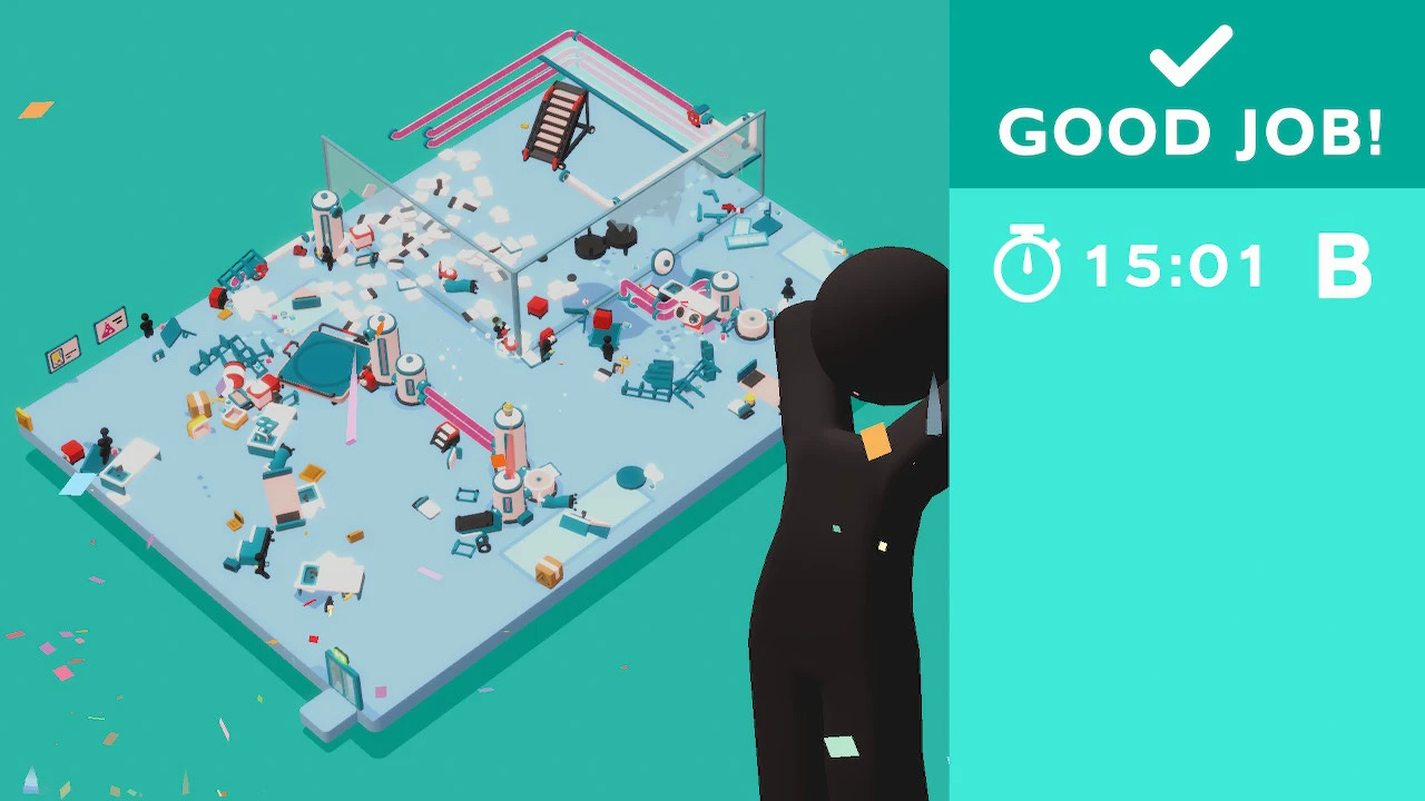 The game evokes feelings of the banality of an office with its water coolers, fake potted plants, plain art and utilitarian equipment, and then lets you tear it apart. It also allows for whimsy with fun uniforms that you can collect along the way. And at the end of each level it gives you the highest score of one of three categories (per Destructoid), the quickest completion time, the fewest items broken, or the total cost of items broken (less cost is better).